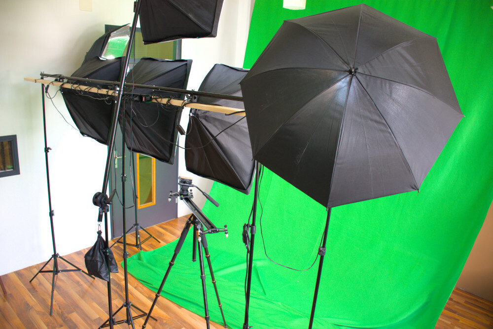 Studio mit Softboxen-Lichtern und Greenscreen für Ihre visuellen Projekte.
